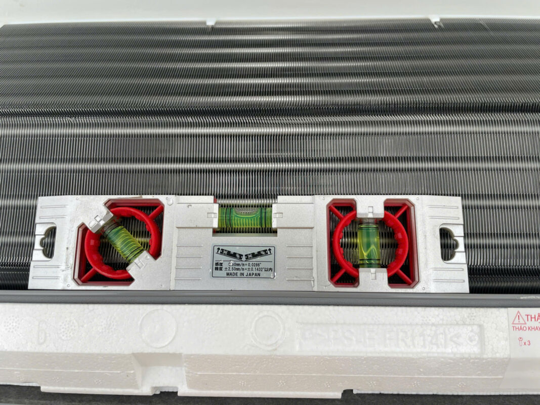 Trước khi cố định dàn lạnh lên tường, kỹ thuật viên tiến hành căn chỉnh thăng bằng bằng thước thủy tích hợp trên máy. Việc lắp đặt đúng cân bằng giúp đường thoát nước ngưng hoạt động ổn định, tránh tình trạng rò rỉ nước và đảm bảo độ bền cho máy lạnh.