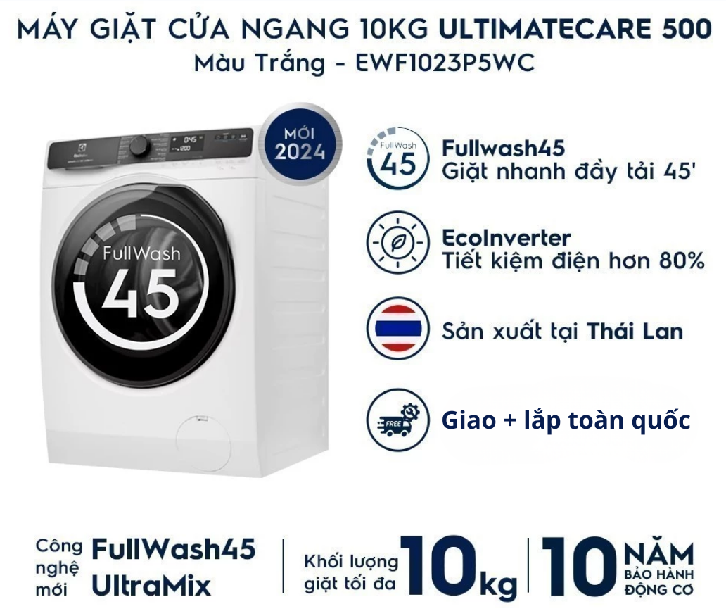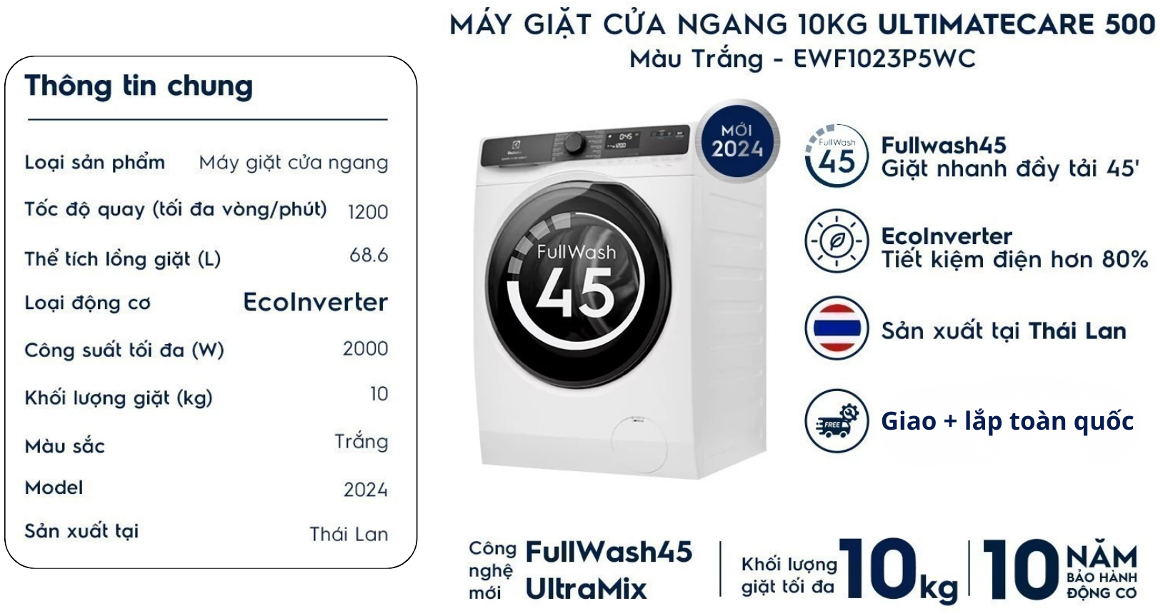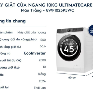 Bảng thông số kỹ thuật máy giặt cửa ngang Electrolux Inverter 10kg EWF1023P5WC