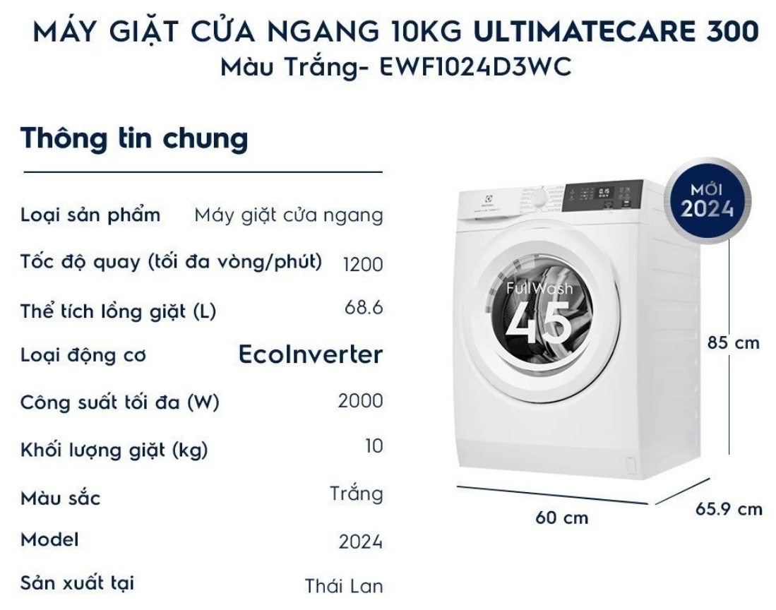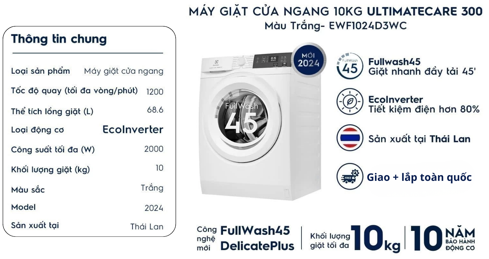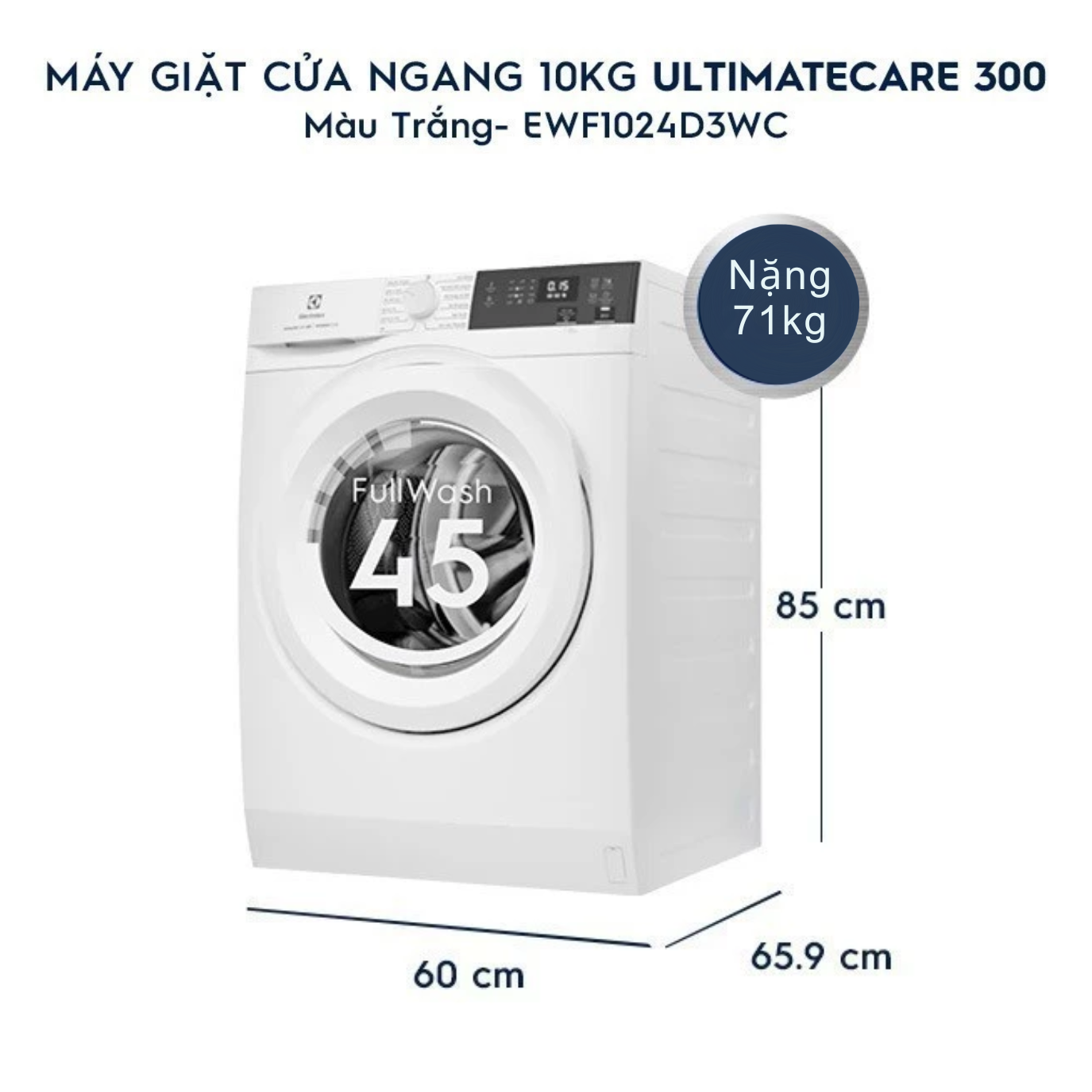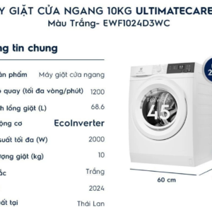 Bảng thông số kỹ thuật máy giặt cửa ngang Electrolux Inverter 10kg EWF1024D3WC