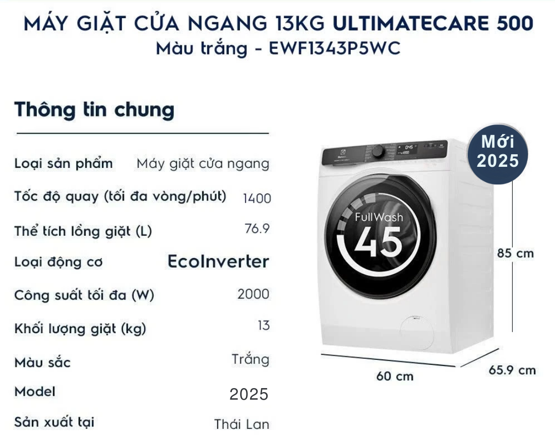 Máy giặt cửa ngang Electrolux 13kg | Máy giặt cửa trước Electrolux Inverter | Máy giặt Electrolux UltimateCare 500 | Máy giặt Electrolux Inverter model 2025 | Máy giặt Electrolux màu trắng | Máy giặt Electrolux cho gia đình đông người | So sánh máy giặt Electrolux UltimateCare 500 và UltimateCare 700 | Bảng giá máy giặt Electrolux mới nhất | Địa chỉ mua máy giặt Electrolux chính hãng, EWF1343P5WC