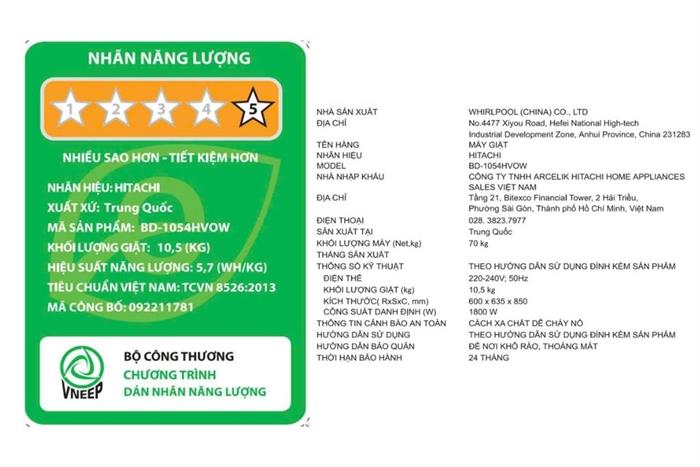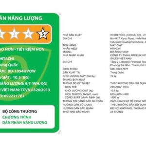 Bảng thông số kỹ thuật máy giặt Hitachi Inverter 10.5kg BD-1054HVOW