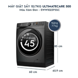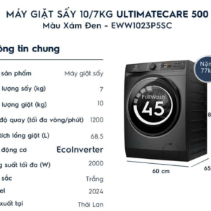 Máy giặt sấy Electrolux UltimateCare 500 Inverter giặt 10 kg – sấy 7 kg EWW1023P5SC thuộc dòng máy giặt sấy cửa trước 2 trong 1 của Electrolux. Với khả năng giặt 10 kg kết hợp sấy 7 kg, sản phẩm đáp ứng tốt nhu cầu giặt giũ hằng ngày, từ quần áo gia đình đến chăn mền hay đồ cần làm khô nhanh. Thiết kế hiện đại, dễ sử dụng cùng khả năng giặt và sấy trong một chu trình giúp người dùng tiết kiệm thời gian, đặc biệt phù hợp cho gia đình từ 5–7 người hoặc căn hộ không có không gian phơi đồ.