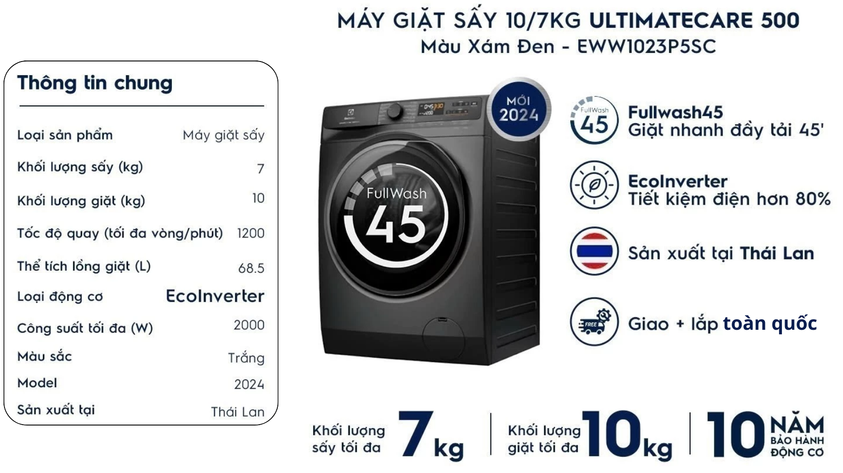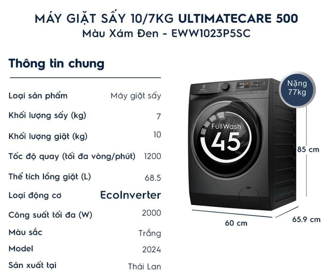 Bảng thông số kỹ thuật máy giặt sấy Electrolux Inverter EWW1023P5SC