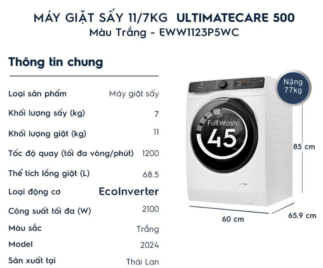 Máy giặt sấy Electrolux UltimateCare 500 Inverter giặt 11 kg – sấy 7 kg EWW1123P5WC là lựa chọn phù hợp cho gia đình đông thành viên, từ 7 người trở lên, với khả năng giặt lên đến 11 kg và sấy 7 kg trong cùng một thiết bị. Sản phẩm được thiết kế nhằm đáp ứng trọn vẹn nhu cầu giặt giũ và sấy khô quần áo trong một quy trình tiện lợi, giúp tiết kiệm thời gian và không gian sinh hoạt.