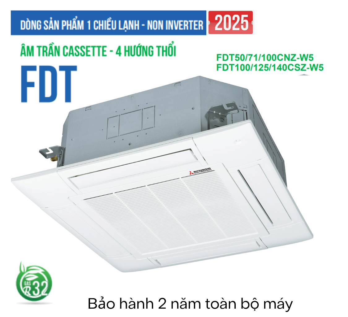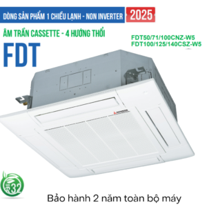 Dòng máy lạnh âm trần cassette Mitsubishi Heavy Industries FDT Non-Inverter 2025 bao gồm các model dàn lạnh: FDT50CNZ-W5, FDT71CNZ-W5, FDT100CNZ-W5, FDT100CSZ-W5, FDT125CSZ-W5 và FDT140CSZ-W5. Đi kèm là các model dàn nóng tương ứng FDC50CNZ-W5, FDC71CNZ-W5, FDC100CNZ-W5, FDC100CSZ-W5, FDC125CSZ-W5 và FDC140CSZ-W5.