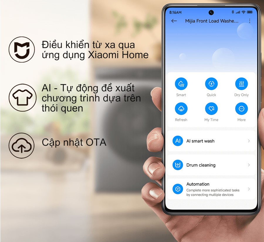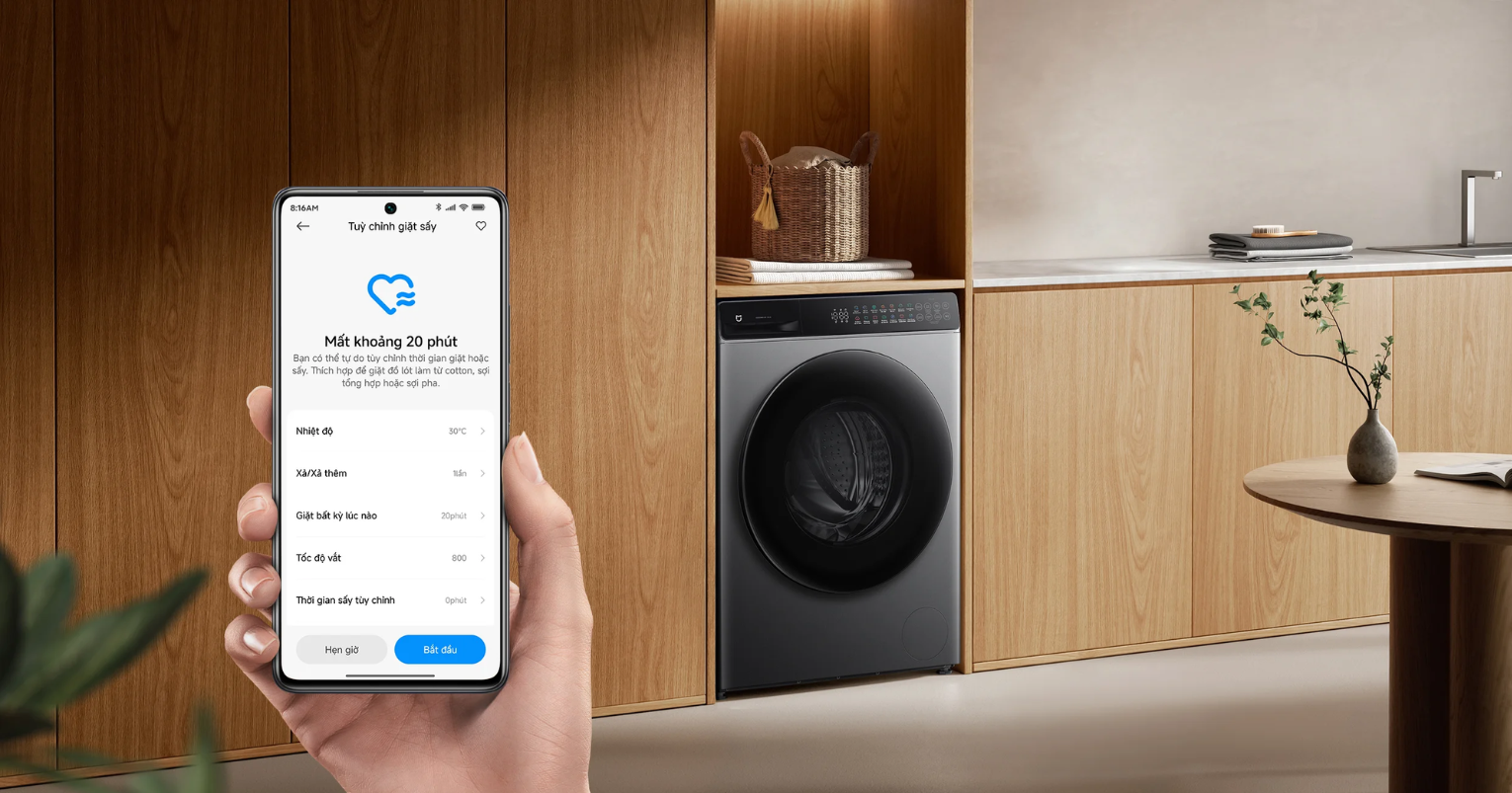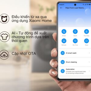 Máy giặt sấy Xiaomi Mijia hỗ trợ kết nối với ứng dụng Xiaomi Home, cho phép người dùng điều khiển máy từ xa, lựa chọn chương trình giặt và theo dõi trạng thái hoạt động. Hệ thống thông minh có khả năng ghi nhớ thói quen sử dụng và đề xuất chương trình phù hợp. Ngoài ra, máy còn hỗ trợ cập nhật OTA, giúp bổ sung tính năng và chương trình giặt mới, mang lại trải nghiệm sử dụng ngày càng tối ưu.