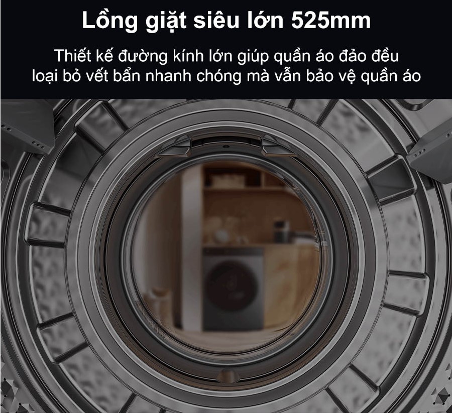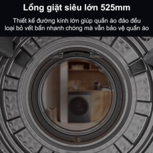 Máy được trang bị lồng giặt siêu lớn với đường kính lên đến 525mm, tạo không gian đảo đồ rộng hơn, giúp quần áo được giặt sạch hiệu quả và hạn chế nếp nhăn. Thiết kế lồng giặt tối ưu lực ly tâm giúp quá trình sấy diễn ra nhanh hơn và hiệu quả hơn. Công nghệ Power Wash tạo lực cơ học mạnh mẽ, hỗ trợ giặt sâu và loại bỏ vết bẩn tốt hơn, mang lại hiệu quả giặt sạch toàn diện.